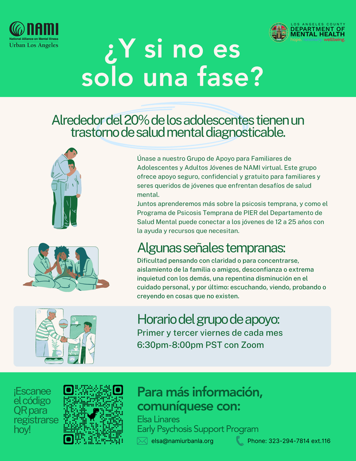 En los Grupos de Apoyo para Familiares de NAMI, las familias se unen en grupos de cuidado y se ayudan los unos a otros mediante el uso de sus experiencias y aprendizajes de cómo lidiar con las enfermedades mentales. Juntos aprenderemos más sobre la psicosis temprana, y como el Programa de Psicosis Temprana de PIER del Departamento de Salud Mental puede conectar a los jóvenes de 12 a 25 años con la ayuda y recursos que necesitan.
